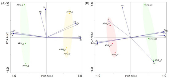 PCA analysis of mineral elements in APM and ATG leaves in different seasons: (A) APM and (B) ATG. APM_g: APM with green leaves; APM_y: APM with yellow leaves; ATG_g: ATG with green leaves; ATG_r: ATG with red leaves.