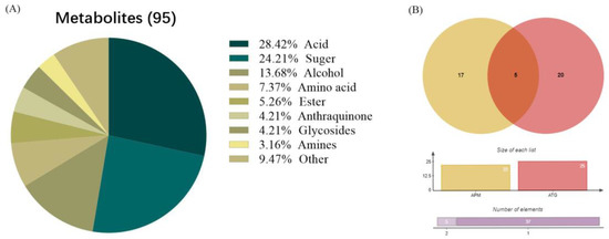 Identification results of non-targeted metabolomics: (A) classification of compounds and (B) Venn diagram description of differential compounds.