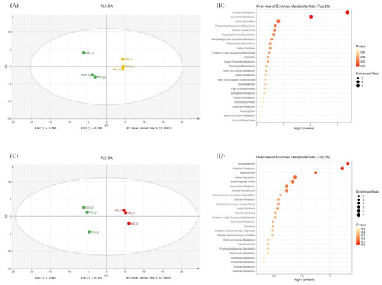 PLS-DA and metabolic pathway enrichment analysis in APM and ATG leaves in different seasons: (A,B) APM; (C,D) ATG.