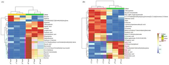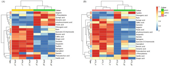 Differences in the accumulation patterns of phenolic compounds in the two studied species are visualized by a clustering heat map (Figure 7). The cluster heat map shows that there were significant differences in metabolites among the different groups under study. It can be observed that the clustering analysis of phenolic compounds of both species was divided into three clusters. After leaf discolouration, whether red or yellow, the metabolites in Cluster 2 were generally higher than in green leaves. This cluster consisted mainly of C6C3C6-type compounds. Most C6C3-type compounds in APM were in Cluster 1, and were more abundant in green leaves. In contrast, this was not the case for ATG. The C6C1-type compounds showed no clear pattern in the clustering analysis of both species. Different biological replicates clustered equally among themselves, indicating good homogeneity among biological replicates and high reliability of the data.