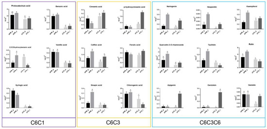 The results of the quantitative analysis of phenolic compounds are shown in Figure 8. In our study, the variability of C6C1-type compounds between the two studied species was greater than their seasonal variability within the same species, and most of these compounds accumulated more in APM, such as benzoic acid, syringic acid, and vanillic acid, which all accumulated three-fold more than ATG. C6C3-type compounds varied significantly with different species and different seasons, with the highest accumulation of cinnamic acid (0.42 μg/g), p-hydroxycinnamic acid (1.33 μg/g), and ferulic acid (0.68 μg/g) in ATG red leaves; in APM, yellow leaves showed caffeic acid (0.50 μg/g), sinapic acid (0.33 μg/g), and chlorogenic acid (16.2 μg/g) in the highest accumulations. The content of the C6C3C6 class of compounds was generally elevated in autumn leaves of different plants. Most of these compounds accumulated in large amounts in the yellow leaves of APM. Notably, the content of apigenin (0.37 μg/g) and genistein (0.48 μg/g) in ATG red leaves was more than ten-fold higher than the other components.