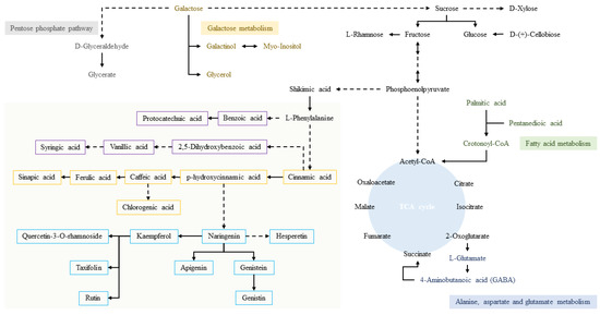Based on the results of metabolomics analysis, the metabolic network was mapped; the relationship between primary metabolism and phenolic compounds is shown in Figure 9. Galactose metabolism and pentose phosphate are in the same branch with pentose phosphate further downstream. Fatty acid metabolism as well as alanine, aspartate, and glutamate metabolism are in the other branch and are all related to the TCA cycle. In addition, different types of phenolic compounds are located in different metabolic pathways.