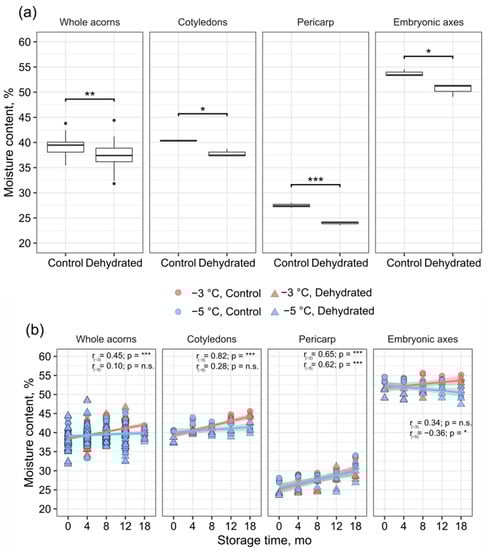 Freshly harvested acorns were characterized by 40% MC and had relatively high germination capacity (82.2 ± 4.4) and seedling emergence rate (68.9 ± 2.9). At the beginning of the experiment, dehydrated acorns showed 38% MC and germinated/emerged in 89%/74%. The hydration levels of each acorn part differed (Figure 1a). The MC of cotyledons was similar to that of whole acorns, whereas the average MC of pericarp ranged from 24 to 27%, and the MC of embryonic axes ranged from 50.6 to 53.7% on average. Each morphological fraction (cotyledons, pericarp, and embryonic axis) of the 38% MC acorns was significantly less hydrated than the corresponding fraction of the 40% MC acorns.