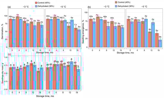 Germination capacity (a), seedling establishment (b) and seedlings dry mass (c) of pedunculate oak acorns stored over 18 mo at −3 °C or −5 °C at 40 or 38% moisture content (MC). Data are the means of three biological replicates ± standard error. The same letters indicate groups that are not significantly different according to Tukey’s test. Capital letters indicate comparisons in time, and small letters refer to comparisons between MC levels at specific time points (a,b) or interaction effects (c). For detailed statistical results, please see Table S3.