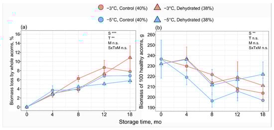 Relative loss of dry biomass of acorn batches with 38% or 40% initial moisture content (M) stored over 18 mo at temperatures (T) of −3 °C or −5 °C (a) and change of biomass expressed per 100 healthy acorns (b). Means (±SE) of three batches are shown. Main effects and a three-way interaction of a factorial ANOVA are given (*** p < 0.001, ** p < 0.01), with S indicating sampling date. For detailed statistical results, please see Table S1.