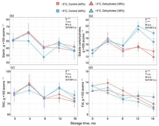 We previously reported that storage of pedunculate oak seeds at a lower-than-optimal temperature strongly affects starch and sucrose metabolism as well as pentose and glucoronate interconversions pathways. An increased abundance of defense-related metabolites and anti-freezing compounds was also reported after 6 mo of storage. These metabolites included monocarbohydrates and sugar alcohols, many of which can function as osmoprotectants and cryoprotectants []. It may be expected that more osmoprotectants would be needed in seeds displaying lower MC, and similarly, more cryoprotectants should be synthesized at lower storage temperatures. Notably, the combination of −5 °C and 38% MC appeared to be the treatment in which the biomass loss was minimal (Figure 2), and at the same time, storage at −5 °C resulted in the highest levels of soluble carbohydrates. This indicates that this lower temperature stimulated the synthesis of cryoprotectants and/or osmoprotectants. It is possible that at −5 °C, the acorns experienced and responded to freezing stress, similar to the freezing stress in acorns stored at −7 °C [], where the risk of ice crystal formation occurs []. To discriminate whether the increase in soluble carbohydrates was the manifestation of mechanisms related to better protection or to the response to stress, the fact that infected acorns had higher-than-average concentrations of starch (as deduced from the difference in patterns between the raw concentration of starch and its standardized pool size) should be considered. Healthy seeds displayed higher losses of starch and therefore were able to adjust their metabolism, including respiration, responses to stimuli, and limitation of deterioration. However, soluble carbohydrates were not correlated with germination capacity or seedling emergence but positively correlated with seedling DM. It is likely that a lower storage temperature induced the synthesis of soluble carbohydrates as a response to subzero temperatures close to freezing. Both seed germination and seedling establishment were positively correlated with pools of starch, TNC, and fat, but not with soluble carbohydrates.