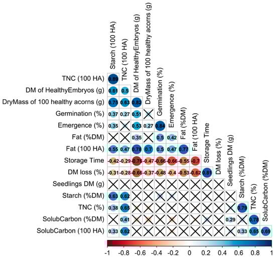 Correlation matrix of evaluated variables. Numbers are Pearson’s correlation coefficients. Crossed blocks indicate a nonsignificant correlation. DM—dry mass; HA—healthy acorns.