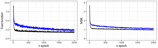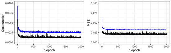 Regarding the number of training cycles or number of epochs, [27] appreciated that as the number of hidden layers increases, the performance of the ANN increases, but in this process, they also required a greater number of epochs. In our study, the training cycles required to achieve stabilization of the cost function and the MSE were 1500 for the prediction of the diameter and 500 for the accumulated volume. [18] performed 500 epochs in the training phase, finding that MSE stabilized after 200 epochs. Socha et al. [3] generated 5000 epoch cycles, but they did not refer to the minimum training cycles necessary to achieve model convergence and avoid over-fitting. Thus, knowing the number of epochs is necessary if efficient and accurate ANNs are to be generated for estimating stem diameter or accumulated volume. Therefore, Socha et al. [3] suggest that the focus of future research should be on the optimization of ANNs. In our study, 476 total combinations of ANNs were evaluated, however, the most complex ANNs—with three hidden layers and 40 neurons in each of them—did not improve the performance of the estimation in the testing phase.
