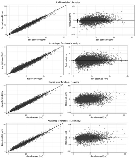 The objective of our study was to compare the performance of taper models in relation to ANNs in different architectures in trees of the species N. obliqua, N. alpina and N. dombeyi. In the case of the evaluation of the taper models, the Kozak [5] model generated the best results according to the RMSE, followed by the Lee et al. [36] model and by the functions of Demaerschalk [34] and Biging [35]—the latter two with similar results. Records like our results are found in Sakici and Ozdemir [27], who found that Kozak’s function generated the best performance according to the RMSE in relation to four taper functions evaluated. This function has been used in numerous investigations which highlight its flexibility and ability to predict the without-bark diameter of a wide variety of forest species [25,40,41,42].