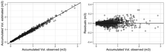 Estimation of the volume without bark accumulated in the base-up direction in the first k-fold of the dataset testing, using the ANN structure selected with the lowest RMSE.