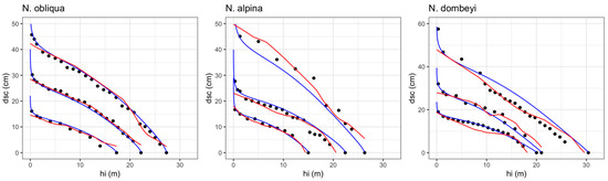 Proof for the estimation of the diameter without bark at different heights for the three selected trees of each species (dots). The blue line represents the estimate generated by Kozak’s (2004) taper function and the red line represents the estimate generated by the one-phase ANN.
