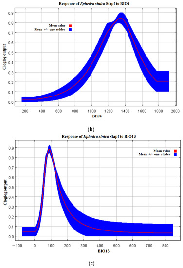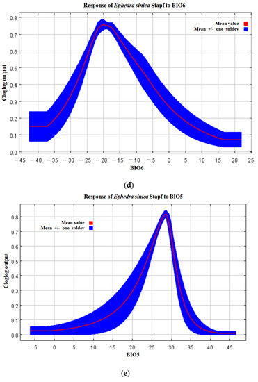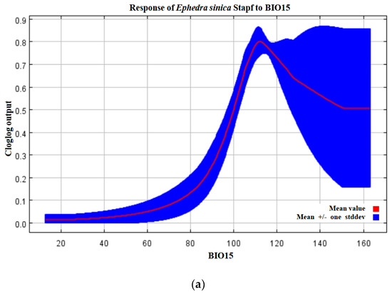 It can be seen from the response curve analysis that the climate characteristics of E. sinica in China’s distribution area are precipitation seasonality (BIO15; 25.4–150.6), temperature seasonality (BIO4; 308.1%–1773.9%), the precipitation of the wettest month (BIO13; 3.0–768.0 mm), the minimum temperature of the coldest month (BIO6; 37.2–16.6 °C), the maximum temperature of the hottest month (BIO5; 1.8–42.1 °C), and the precipitation of the coldest month (BIO19; 0–461.0 mm). Six bioclimatic factors mainly determine the living range of E. sinica and also show the species’ basic niches formed in the process of adapting to the environment. This shows that the growth of E. sinica is mainly affected by “extreme” precipitation and “extreme” temperature. It has a wide range of temperature tolerance, can withstand a certain degree of low temperature, and is suitable for growing in arid and semi-arid deserts, grassland, sandy land, river beaches, etc. (Figure 4).