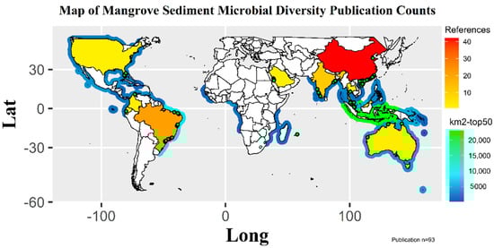 Map of mangrove sediment microbial diversity publication counts. The country polygon fill gradient indicates the number of publication counts while the polygon outline represents the top 50 mangrove coverage in km2 according to the continuous mangrove forest cover for the 21st century (CGMFC-21) created by Hamilton et al. []. The green plots are the sampling plots of each publication. The figure was generated using the ggplot2 package [] in R [] using the Mercator projection.