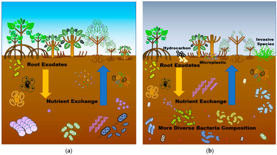 Despite their multiple ecosystem services as shown in Figure 1, mangrove ecosystems have undergone serious alterations largely induced by anthropogenic activities [,,], monsoons, and tidal effects. The reduction of mangrove forests has been estimated at 1%–2% per year globally and accumulate to about 35% since the year 2000 []. Human and natural impacts have left us with well-preserved, regenerated, and disturbed mangrove ecosystems. Well-preserved (pristine) mangroves are naturally regenerated, healthy mangrove forests with less human disturbance and low pollution. Restored (also termed regenerated, reforested, or rehabilitated) mangroves include both naturally and anthropogenically planted mangrove trees as conservation. The latter are mainly monospecies plantations used to curb soil erosion and serve as a reintroduction of vegetation in coastal areas. Disturbed mangrove forests are degraded or deforested mangroves which are subjected to contaminants such as hydrocarbons, human wastewater, sewage, microplastics, invasive species, and others. This group of mangrove forests have high artificially introduced nutrients which alter the mangrove ecosystem equilibrium of the microbial community and its mangrove host.