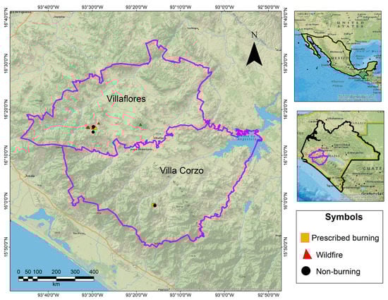 However, studies on the effect of prescribed burning on plant biodiversity indices and carbon storage in above- and belowground pools are still limited in many parts of the world. Furthermore, the results regarding the effect of prescribed burning on forest biomass and soil carbon stocks are controversial. Some studies reported that prescribed burning has a positive or neutral effect on carbon sequestration [40,41,42], while others reported a negative effect leading to carbon loss [22,43,44]. While the damage caused by wildfires is more frequent in southern Mexico, there is an increasing need to study ecosystem response to prescribed burning in terms of plant diversity and carbon storage. Therefore, the objective of this study was to evaluate the effect of prescribed burning on plant diversity indices, forest biomass stocks, and soil carbon storage in tropical highland forest ecosystems in southern Mexico.