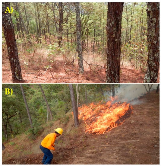 Prescribed burning is the intentional use of fire by management actions under applicable regulations to meet specific objectives, while wildfire is an unplanned wildland fire or blaze caused naturally or by humans without authorization [48]. In this study, prescribed burns were carried out in 2015 and 2016, following the Mexican government’s NOM-015 rules and guidelines which establish the technical specifications for the use of controlled fire in forests, crops, and rangeland ecosystems [49]. It was carried out under constant monitoring of wind speed and direction, atmospheric temperature, and relative humidity by trained personnel [15]. The blaze of 2015 affected the sites we sampled as wildfire, whereas non-burning sites had no history of fire for the past 30 years. In prescribed burning sites, the fire was intentionally used to reduce forest fuel load by the end of the winter season but before the start of the hot dry season. It was carried out in the morning hour when the air temperature was about 18–25 °C, the atmospheric humidity was higher than 40%, and the wind speed was low. Ignition started from the upper part of the slopy terrain and proceeded downward. The perimeter of each destined area was cleared for firebreaks before ignition. The thickness of forest fuel ranged between 5 and 12 cm before burning (Figure 2).