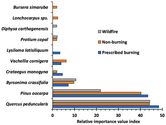 Ten tree species were identified from all sites, but based on the relative importance value index (RVI), three were considered predominant. Among them, Quercus peduncularis was the most important with an RVI of 48.35 at prescribed burning, 44.16 at non-burning, and 44.33 at wildfire sites. The second species of the higher order of importance was Pinus oocarpa for all burning sites, but its RVI decreased sharply in wildfire sites (Figure 3). At the same time, Brysonima crassifolia, a non-native species, increased in wildfire sites compared to non-burning and prescribed burning (Figure 3).