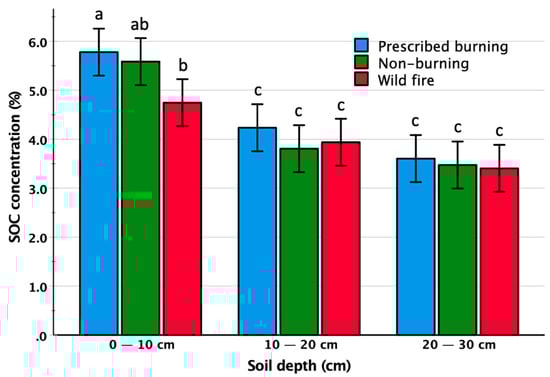 Soil organic carbon concentrations (%) by depth class among prescribed burning, non-burning, and wildfire sites. Different letters above the bars indicate statistically significant differences (Tukey p < 0.05) between burning treatments within the same depth class. Error bars correspond to the respective 95% confidence intervals.