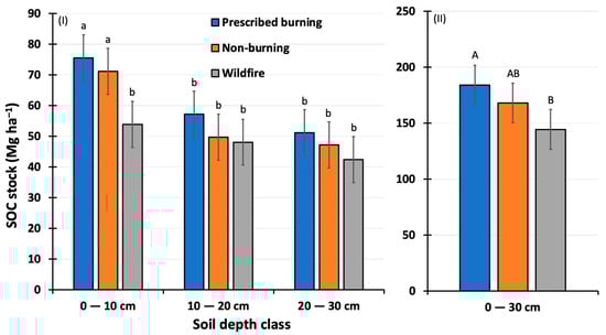 Soil organic carbon (SOC) stocks (Mg C ha−1) among prescribed burning, non-burning, and wildfire sites at different depth classes (I), and the sum of SOC stocks down to 30 cm depth (II). Error bars denote 95% confidence intervals. Different letters above bars indicate significant differences (Tukey p < 0.05) between burning types within the same soil depth class.