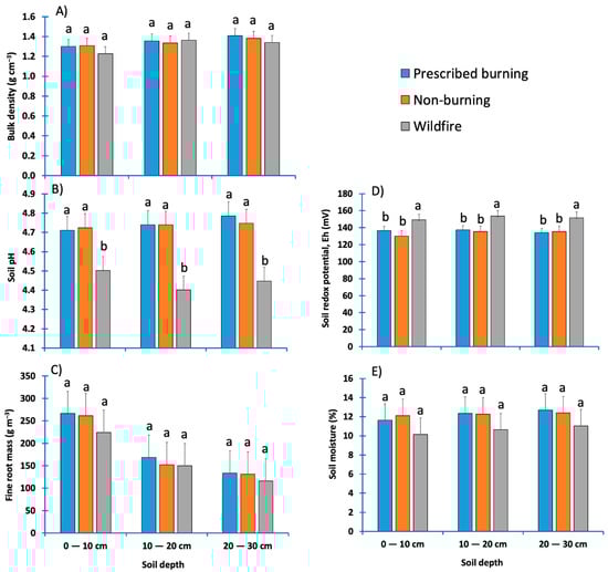 Soil properties and fine root biomass among prescribed burning, non-burning, and wildfire sites at different depth classes. (A) Soil bulk density, (B) soil pH, (C) fine root mass, (D) soil redox potential, and (E) soil moisture. Error bars indicate respective 95% confidence intervals. Different letters over the bars indicate significant differences between burning types (p < 0.05) within the same depth class.