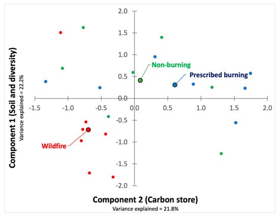 Principal components 1 and 2 collectively explained 44% of the variance. In Figure 7, we plotted them, putting component 1 as the y-axis and component 2 as the x-axis. We observed that most of the prescribed burning and non-burning sites were distributed in the upper panel of the graph, indicating that these sites are characterized by higher tree diversity and soil pH. Wildfire sites are mostly distributed in the lower panel of the graph, indicating lower tree diversity and lower soil pH. In general, both non-burning and prescribed burning sites were distributed throughout the x-axis, but a greater number of sites appeared in the right panel, indicating the trend of higher carbon stocks. Wildfire sites are distributed in the left panel, showing lower carbon storage (Figure 7).