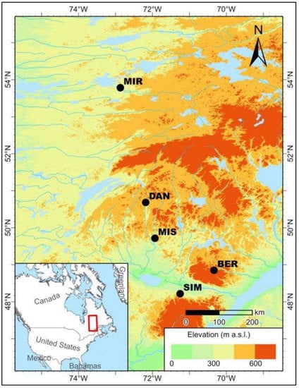 This study was conducted at five permanent sites (Mirage (MIR), Camp Daniel (DAN), Mistassibi (MIS), Bernatchez (BER), and Simoncouche (SIM)) along a latitudinal gradient located between the 48th and 54th parallels in the boreal coniferous forest of Quebec, Canada (Figure 1). MIR, the northernmost site, was situated in the black spruce–lichen bioclimatic domain; while DAN and MIS were located in the black spruce–moss bioclimatic domain; and BER and SIM were in the balsam fir–white birch bioclimatic domain [22].