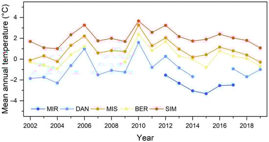 The annual temperatures were correlated across sites (p < 0.01), with correlation coefficients > 0.90, indicating that our study sites experienced similar inter-annual variation in temperature (Figure 2). The warmest years were 2006, 2010, and 2012. The coldest years during the study period were 2002, 2004, and 2019. The difference in temperature across sites was explained using latitude and altitude. On average, we recorded a difference of 4.6 °C between the warmest (SIM) and coldest (MIR) sites. BER, the highest elevation site, was on average 0.6 °C colder than MIS, which was situated at a higher latitude than BER. No significant trend in the annual temperature was observed during the study period (p < 0.05).