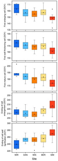 On average, cell enlargement began earlier at the southernmost site (SIM), at the end of May (DOY 149), and later at the northernmost site (MIR), in mid-June (DOY 163) (Figure 3). The timings of the first enlarging cells at the other three sites ranged from DOY 154 at MIS to DOY 158 at BER. The onset of cell wall thickening and lignification and the appearance of the first mature cell followed a similar pattern to the onset of cell enlargement. The timings of the cell wall thickening and lignification started from mid- to late-June, from DOY 161 at SIM to DOY 175 at MIR. The first mature cell occurred in late June (DOY 174) at SIM and 15 days later at MIR.