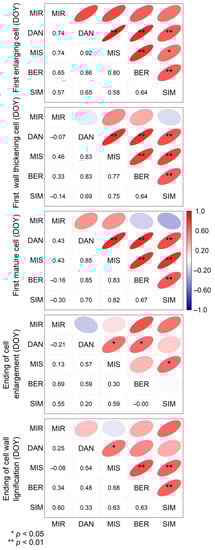 Correlation matrix for the xylem phenology of black spruce between five permanent sites in the boreal forest of Quebec, Canada. Pearson’s r values are represented by both values and ellipse colors. Narrower ellipses represent high correlation, and the asterisks indicate significant correlation coefficients.
