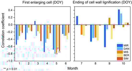 We found high correlations between the onset of cambial activity and the mean May temperature (p < 0.01) at all sites except MIR, with r ranging from −0.61 to −0.77. Accordingly, the onset of cambial reactivation occurred earlier under warmer May temperatures (Figure 6). Although the temperatures of the previous months (January–April) had the same trends, the negative correlations with the onset of xylogenesis were not significant (p > 0.05).