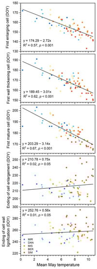 Based on causal modeling, Rossi et al. [36] suggested that the timing of the first enlarging cell could directly influence the timings of the first wall-thickening cell and the first mature cell. Consequently, the climatic factors affecting the onset of cell enlargement may also influence the successive timings of xylogenesis. In our study, the inter-annual variations among the spring phases of xylem phenology were similar. In addition, the timings of the first wall-thickening cell and the first mature cell were also highly correlated with the mean May temperature. The initiation of cell differentiation is related to the same pool of cells, namely, the first developing cells in xylogenesis, which could explain our findings [36].