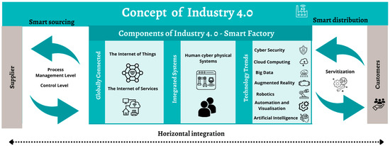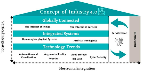 One of the tools for adapting to a changing environment is the introduction of information technology, cyber-physical systems and artificial intelligence systems into the production and services in all sectors of the economy [7,8,9]. The impact of these changes is so significant that we refer to them as the fourth stage of the Industrial Revolution [7]. This phenomenon was presented in Germany at the “Hannover Fair” in Hannover in 2011 as a proposal for a new concept of economic policy for Germany [10,11,12,13]. This direction of innovative technologies is characterized by the intelligent vertical and horizontal interconnection of people and machines [7,14,15,16,17] and objects and information and communication technology systems [17].