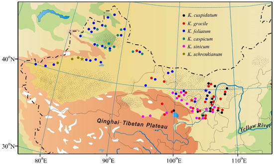 Kalidium (Amaranthaceae) is a genus of succulent halophytes with five species (Kalidium caspicum (L.) Ung.-Sternb., Kalidium cuspidatum (Ung.-Sternb.) Grubov., Kalidium foliatum (Pall.) Moq., Kalidium gracile Fenzl, and Kalidium schrenkianum Bunge ex Ung.-Sternb.), mainly distributed as shrubs in Northwest Asia and Southeast Europe. Some authorities have also recognized K. wagenitzii as an endemic species in Turkey, but others include it in K. foliatum [16]. In addition, two varieties of K. cuspidatum (var. cuspidatum and sinicum A. J. Li) have been recognized as separate species [17]. Here these varieties are called species, mainly due to genetic differences in DNA barcodes [17], but partly because our results indicate that they have significant adaptive differences. All six Kalidium species (including the two varieties of K. cuspidatum as species) naturally grow in deserts in northwest China. These succulent halophytes provide important fodder for livestock in winter, and have high ecological value for soil and water conservation in their semi-arid and arid areas. An extensive field survey showed that their distributions in China significantly differ (Figure 1). K. foliatum is the most widespread. Most K. cuspidatum sites are in Ningxia, K. gracile is mostly located in Gansu, Qinghai and Inner Mongolia. K. sinicum is naturally distributed in East Gansu and West Ningxia, while K. caspicum and K. schrenkianum are mainly restricted to regions north and south of the Tianshan Mountains in Xinjiang, respectively.