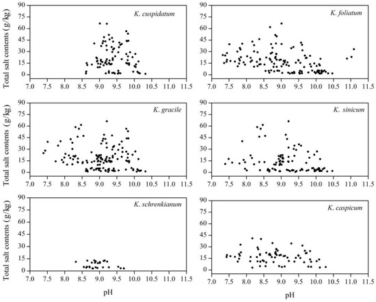Scatter plots of total salt contents and pH of soil samples from areas occupied by indicated Kalidium species.