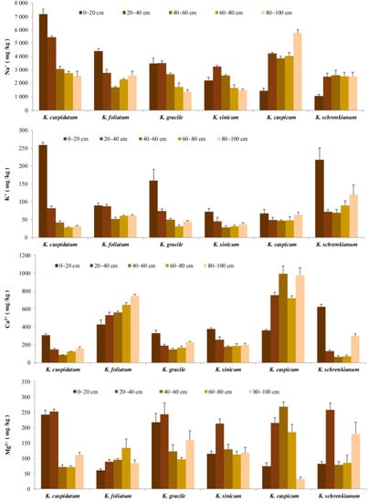 Ca2+ was the second most abundant cation in all tested soil samples (Figure 4). In K. foliatum and K. caspicum areas, mean concentrations increased as soil depth increased, reaching 0.74 and 0.98 g/kg at 80–100 cm, respectively. In contrast, in K. cuspidatum and K. sinicum areas, mean Ca2+ concentrations declined as depth increased and then increased (Figure 4), to <86 mg/kg at 40–60 cm in K. cuspidatum areas (Figure 4). Overall, as shown in Table 1, there was a negative correlation between mean Ca2+ concentrations and total salt contents in the topsoil (r = −0.841, p < 0.05), but a positive correlation between them at 60–80 cm (r = 0.934, p < 0.05) and 80–100 cm (r = 0.965, p < 0.01).