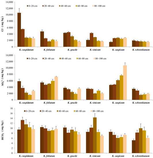 Concentrations of Cl−, SO42−, and HCO3− in soil from indicated depths in areas occupied by the six Kalidium species. The values shown are means with SE (n = 3).