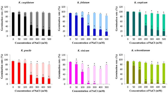 Total germination percentages after 14 days at the indicated NaCl concentrations in the six studied Kalidium species. Germination rates (%, means and standard deviations) of the six Kalidium species after treatments with indicated concentrations of NaCl (0, 50, 100, 200, 300, 400, and 500 mM NaCl) after 7 days. The dark bars indicate germination rates after the treatments and light bars the total percentages that germinated during the recovery treatment in distilled water with additional 7 days. Asterisks indicate significant differences in each condition respect to the corresponding control (according to Dunnet test, p < 0.05).