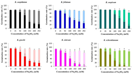 Total germination percentages after 14 days at the indicated Na2SO4 concentrations in the six studied Kalidium species. Germination rates (%, means and standard deviations) of the six Kalidium species after treatments with indicated concentrations of Na2SO4 (0, 25, 50, 100, 150, 200, and 250 mM) after 7 days. The dark bars indicate germination rates after the treatments and light bars the total percentages that germinated during the recovery treatment in distilled water with additional 7 days. Asterisks indicate significant differences in each condition respect to the corresponding control (according to Dunnet test, p < 0.05).