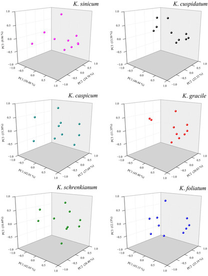 Score plots obtained from Principal Component Analysis (PCA) of effects of abiotic factors on distributions of the six Kalidium species. x axis, y axis, and z axis indicate the first, the second and the third Principle Component, respectively.