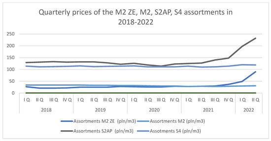 Quarterly prices for M2 ZE, M2, S2AP, S4 assortments in years 2018–2022. Source: Own elaboration based on data obtained from the State Forests IT System (own elaboration based on the Computer Management Support System of the State Forests National Forest Holding).