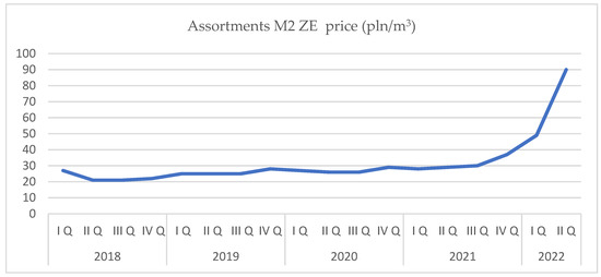 Prices for the M2 ZE assortment at quarterly intervals in years 2018–2022. Source: Own elaboration based on data obtained from the State Forests IT System (SILP).