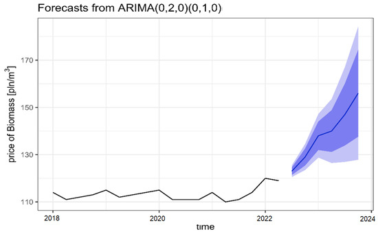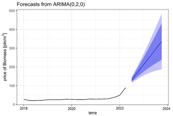 The results of the sensitivity test for the use of the ARIMA model to forecast forest biomass prices are presented above. The largest errors are characterised by the M2ZE assortments of approximately 45.56% of the percentage error, while the smallest error was found in the M2 assortment, where MAPE was 2.55% (Table 5).