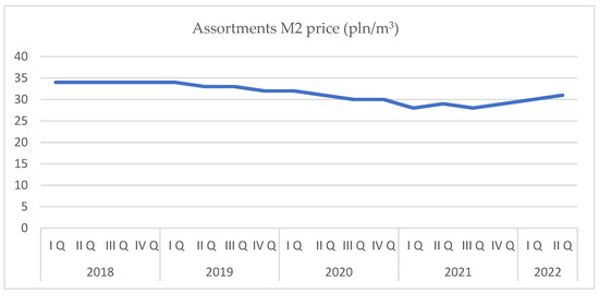 Prices for the M2 assortment at quarterly intervals in years 2018–2022. Source: Own elaboration based on data obtained from the State Forests IT System (SILP).