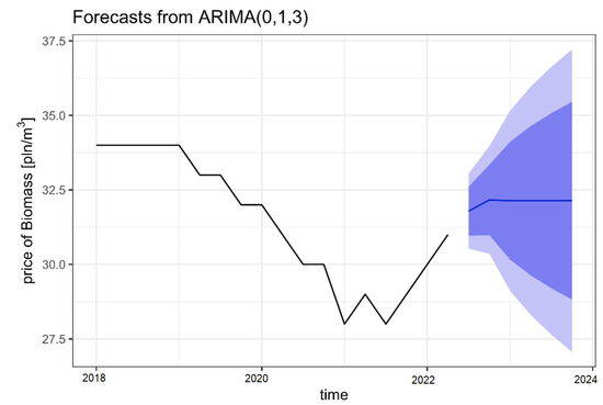 Prices of residual wood ranged between 20 and 30 PLN/m3. We can observe a significant increase in the price in Q4 of 2021, which continued in Q1 and Q2 of 2022. This factor influences the forecasting procedure for the data provided (Figure 2).