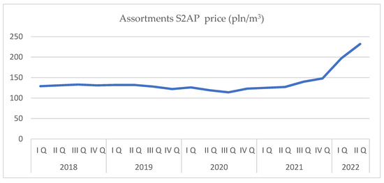 Prices for the S2AP assortment at quarterly intervals in years 2018–2022. Source: Own elaboration based on data obtained from the State Forests IT System (SILP).
