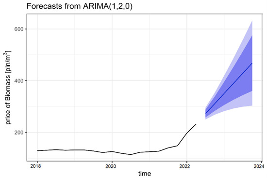 The comparison of data with the application of the ARIMA model showed a significant increase in the prices that may be adopted by the State Forests in 2023, and in subsequent years, that is due to, i.e., the change in prices between the Polish and Western European markets on the one hand, and the Baltic and Scandinavian markets on the other [31].