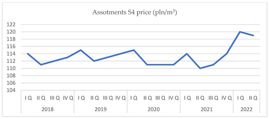 Prices for the S4 assortment at quarterly intervals in years 2018–2022. Source: Own elaboration based on data obtained from the State Forests IT System (SILP).