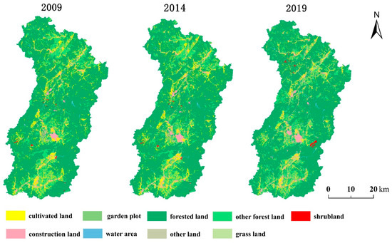 Land use data for woodlands in the study area (2009–2019) are summarized in Table 5 after reclassification. The total woodland area decreased over the 10-year period, from 178,863.66 ha in 2009 to 173,904.39 ha in 2019, a net decrease of 4959.27 ha. Among the different woodland types, the largest decrease occurred in forestland area, with a net decrease of 3064.15 ha. ‘Other woodland’ area also decreased markedly, with a net decrease of 2044.99 ha, while the net decrease in shrubland area was only 149.88 ha. Overall, the decrease in woodland area over the latter 5 years (2014–2019) was greater than that in the previous 5 years (2009–2014).