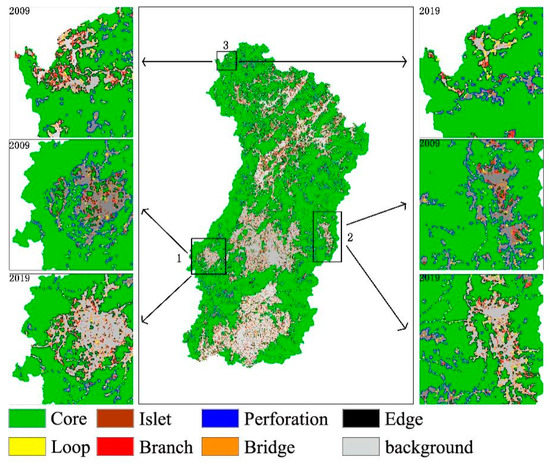 Spatial pattern of woodland MSPA for typical land types in Anyuan County, 2009–2019.
