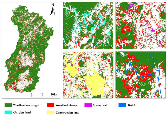 Location map of woodland changes in Anyuan County. ((a) indicates woodland change around garden land, (b) indicates woodland change around mining land, (c) indicates woodland change around construction land and (d) indicates woodland change around roads).